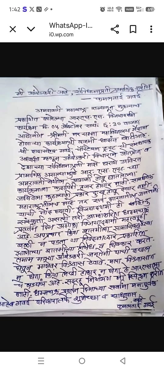 अमरावती, महाराष्ट्र – भारत के मुख्य न्यायाधीश (सीजेआई) बी.आर. गवई की मां कमलताई गवई के आरएसएस के विजयादशमी कार्यक्रम में शामिल होने को लेकर चल रहा विवाद गहराता जा रहा है। एक ओर जहां सोशल मीडिया पर उनके नाम से एक पत्र वायरल हुआ है जिसमें निमंत्रण अस्वीकार करने की बात कही गई है, वहीं परिवार के सदस्य उनके कार्यक्रम में शामिल होने की पुष्टि कर रहे हैं। यह मामला वैचारिक मतभेदों और सोशल मीडिया की अफवाहों के बीच उलझता जा रहा है।