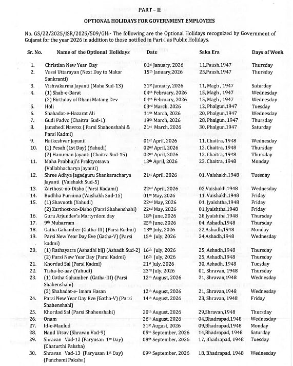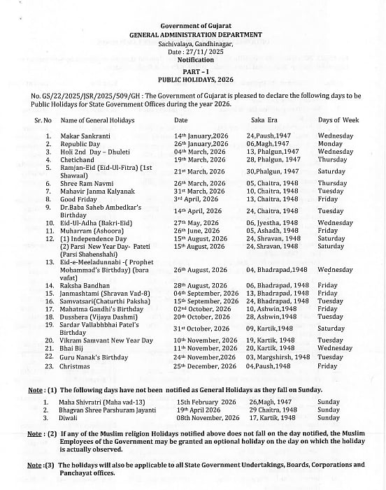 गुजरात सरकार के सामान्य प्रशासन विभाग द्वारा 27 नवंबर को जारी अधिसूचना संख्या जीएस/22/2025/एसआर/2025/509/जीएच के अनुसार, वर्ष 2026 के लिए राज्य सरकार के कार्यालयों में सार्वजनिक अवकाश निम्नलिखित तिथियों पर घोषित किए गए हैं: 14 जनवरी को मकर संक्रांति (बुधवार), 26 जनवरी को गणतंत्र दिवस (सोमवार), 4 मार्च को होली दूसरा दिन-ढुलेटी (बुधवार), 19 मार्च को चेटिचंद (गुरुवार), 21 मार्च को रमजान ईद (ईद-उल-फित्र) प्रथम शाव्वाल (शनिवार), 26 मार्च को श्री राम नवमी (गुरुवार), 31 मार्च को महावीर जन्म कल्याणक (मंगलवार), 3 अप्रैल को गुड फ्राइडे (शुक्रवार), 14 अप्रैल को डॉ. बाबासाहेब आंबेडकर का जन्मदिन (मंगलवार), 27 मई को बकरी ईद (ईद-उल-अजा) (बुधवार), 26 जून को मुहर्रम (शुक्रवार), 15 अगस्त को स्वतंत्रता दिवस एवं पारसी नव वर्ष दिवस-पटेटी (शनिवार), 26 अगस्त को ईद-ए-मिलादुन्नबी (बारा वफात) (बुधवार), 28 अगस्त को रक्षा बंधन (शुक्रवार), 4 सितंबर को जन्माष्टमी (श्रावण वाद-8) (शुक्रवार), 15 सितंबर को संवत्सरी/गणेश चतुर्थी (सोमवार), 2 अक्टूबर को महात्मा गांधी का जन्मदिन (शुक्रवार), 20 अक्टूबर को दशहरा (विजय दशमी) (मंगलवार), 31 अक्टूबर को सरदार वल्लभभाई पटेल का जन्मदिन (शनिवार), 8 नवंबर को दीपावली (रविवार), 10 नवंबर को विक्रम संवत् नव वर्ष दिवस (सोमवार), 11 नवंबर को भाई बीज (बुधवार), 24 नवंबर को गुरु नानक जयंती (मंगलवार), तथा 25 दिसंबर को क्रिसमस (शुक्रवार)