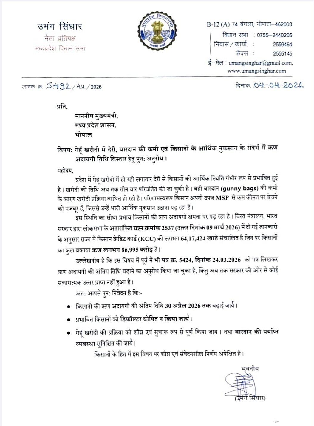 उन्होंने यह भी बताया कि इस मुद्दे को लेकर वे पहले भी 24 मार्च 2026 को सरकार को पत्र लिख चुके हैं, लेकिन अब तक कोई ठोस कार्रवाई नहीं की गई है। सिंघार ने इसे सरकार की उदासीनता बताते हुए कहा कि किसानों के मुद्दों पर इस तरह की अनदेखी उचित नहीं है। उन्होंने सरकार से मांग की कि किसानों की ऋण अदायगी की अंतिम तिथि 30 अप्रैल 2026 तक बढ़ाई जाए और प्रभावित किसानों को डिफॉल्टर घोषित न किया जाए।