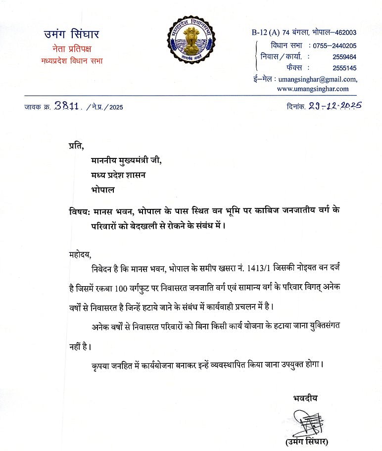 मुख्यमंत्री को लिखे पत्र में उमंग सिंघार ने उल्लेख किया कि यह बस्ती कोई नई अतिक्रमण नहीं है, बल्कि लगभग सात दशक पुरानी है, जहां पीढ़ियों से आदिवासी और अनुसूचित जाति समुदाय के परिवार रह रहे हैं।