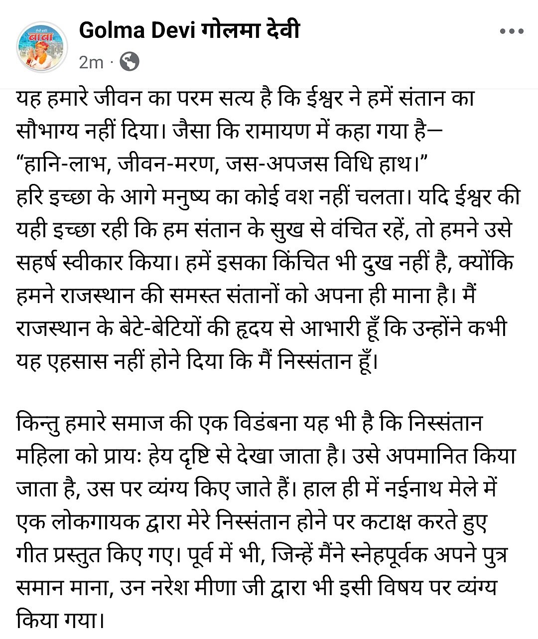 गोलमा देवी ने एक बयान में कहा: "यह हमारे जीवन का परम सत्य है कि ईश्वर ने हमें संतान का सौभाग्य नहीं दिया। जैसा कि रामायण में कहा गया है - 'हानि-लाभ, जीवन-मरण, जस-अपजस विधि हाथ। हरि इच्छा के आगे मनुष्य का कोई वश नहीं चलता।' यदि ईश्वर की यही इच्छा रही कि हम संतान के सुख से वंचित रहें, तो हमने उसे सहर्ष स्वीकार किया। हमें इसका किंचित भी दुख नहीं है, क्योंकि हमने राजस्थान की समस्त संतानों को अपना ही माना है। मैं राजस्थान के बेटे-बेटियों की हृदय से आभारी हूँ कि उन्होंने कभी यह एहसास नहीं होने दिया कि मैं निस्संतान हूँ। किन्तु हमारे समाज की एक विडंबना यह भी है कि निस्संतान महिला को प्रायः हेय दृष्टि से देखा जाता है। उसे अपमानित किया जाता है, उस पर व्यंग्य किए जाते हैं। हाल ही में नईनाथ मेले में एक लोकगायक द्वारा मेरे निस्संतान होने पर कटाक्ष करते हुए गीत प्रस्तुत किए गए। पूर्व में भी, जिन्हें मैंने स्नेहपूर्वक अपने पुत्र समान माना, उन नरेश मीणा जी द्वारा भी इसी विषय पर व्यंग्य किया गया। यह सत्य है कि मैं संतान के सौभाग्य से वंचित रही हूँ, परंतु इसे लेकर मेरे मन में कोई शोक नहीं है। मैंने जन-जन को अपना परिवार मान लिया है और उनके लिए अपना जीवन समर्पित कर दिया है। फिर भी जब कोई ऐसी टिप्पणी करता है, तो मन में स्वाभाविक रूप से एक टीस उठती है। उस क्षण मनुष्य अपने भाग्य को कोसता है और ईश्वर से प्रश्न करता है।